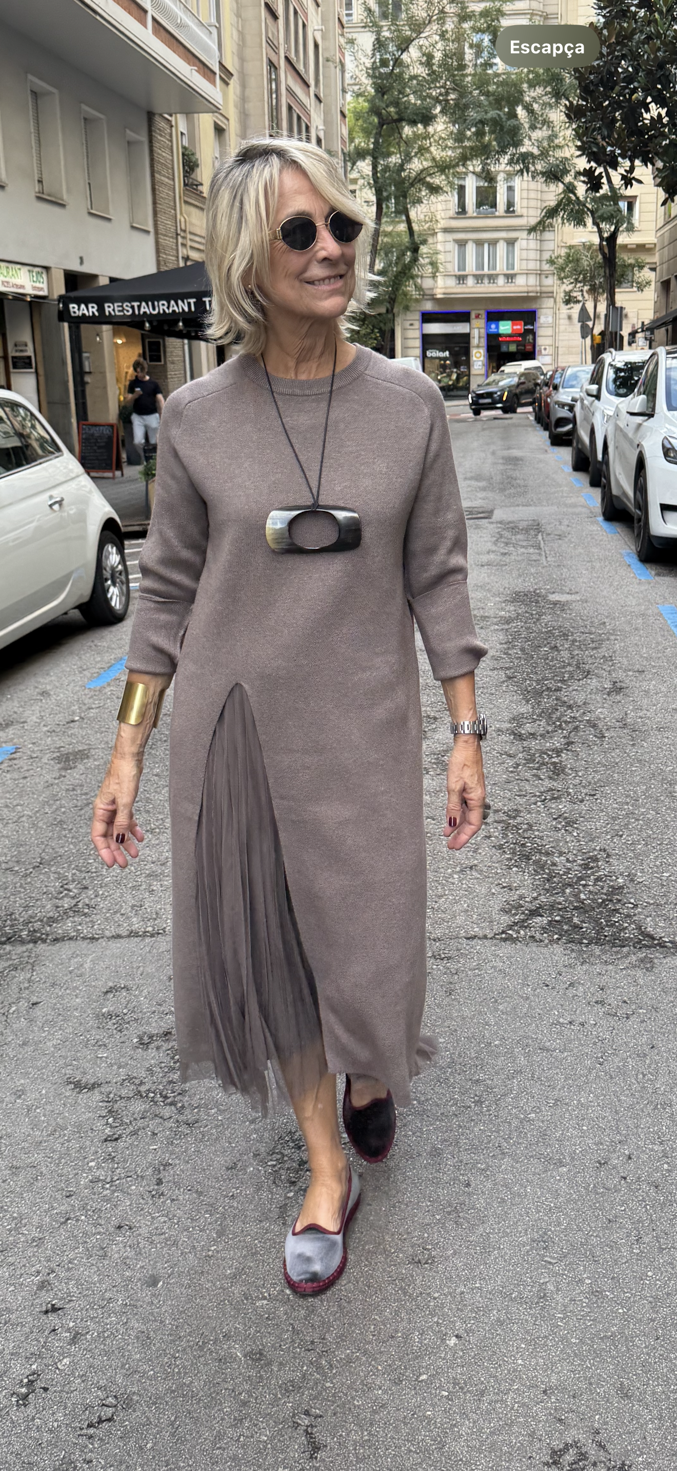 Podstawowa sukienka jest przyjazna dla skóry, a zewnętrzna tiulowa spódnica ma wyściełane ramiączka, które zapewniają warstwowy, zwiewny i elastyczny wygląd. W połączeniu z długim swetrem jest ciepły i miękki. Okrągły dekolt wysmukla szyję, a długie rękawy zapewniają ciepło, ale nie obciążają. Boczne rozcięcia dodają seksapilu i sprawiają, że jest niezwykle stylowa podczas ruchu.