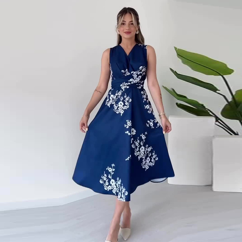Sukienka damska bez rękawów z nadrukiem i dekoltem w serek