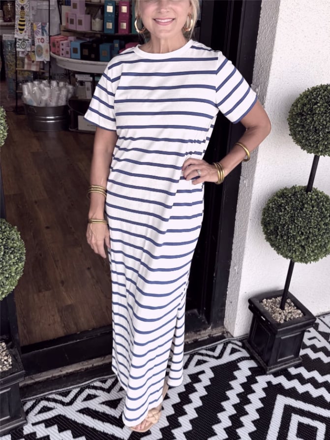 Ta sukienka koszulka ma okrągłą szyję i zabawne paski , łącząc komfort ze stylem. Kieszenie boczne są praktyczne, a boczny podział dodaje nowoczesnego dotyku i zwiększa mobilność.